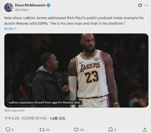 北京时间1月14日,湖人141-116大胜老鹰。詹姆斯赛后接受ESPN采访,回应里奇-保罗关于里夫斯的言论。詹姆斯说:“里夫斯知道我对他的看法,我俩每天都在交流。我希望里夫斯和他的团队不要认为,里奇那些话是我让他传达的。”