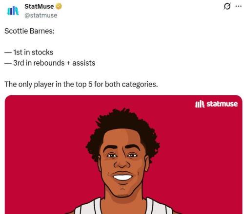 其中抢断+盖帽联盟第一,篮板+助攻联盟第三,这让其成为本赛季唯一一位两项综合数据均排在前五的球员,可见巴恩斯作为“新龙王”的全能性。