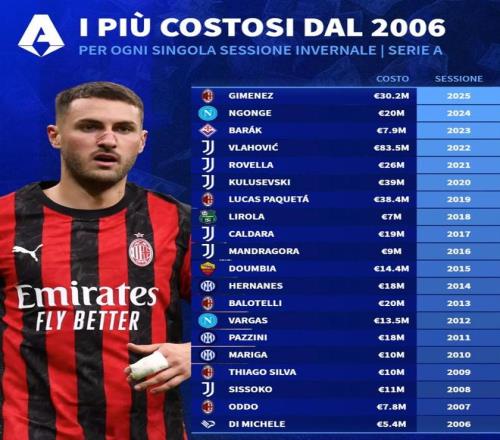 北京时间1月13日,德转列出了2006年至2025年意甲俱乐部历年冬窗引援的标王,尤文图斯2022年1月8350万欧元从佛罗伦萨引进弗拉霍维奇高居第一。