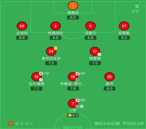 卡里克首段任期的最后一场比赛是2021/2022赛季英超第14轮主场迎战阿森纳。那场比赛,卡里克排出了4-2-3-1的阵型。首发门将是德赫亚,四名后卫分别是特莱斯、马奎尔、林德洛夫、达洛特,中场弗雷德、麦克托米奈、B费,拉什福德和桑乔分居两翼,单前锋是C罗。那场比赛,C罗双响,B费破门,曼联主场3-2战胜阿森纳。